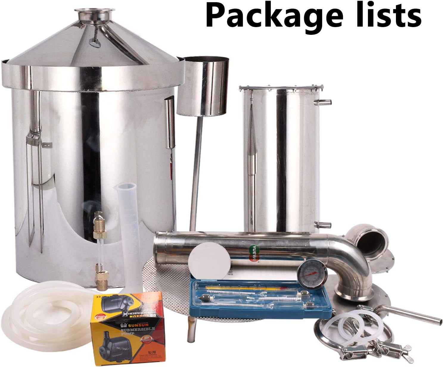 Thanks for Shopping in our Amazon Store, we are a professional business company, we YUEWO have engaged in online business for about 9 years, we always providing the best products and the best service! This set of home distiller is a complete wine making sets; it is very easy to be set up and use, It's particularly suitable for the production of spirits with a strong aroma ( brandy, whiskey,fruit brandy, ecc.) , also for essential oils ( perfumes, remedy, and liquors ) but most of all for high graded alcohol ( vodka ). it can make pure water also. The construction is all Stainless steel which has been argon welded thus avoiding any of the health problems associated with stainless still and solder constructed stills. Welding technique: The item is argon welded to avoid any of the health issues associated with welding and solder constructed alcohol stills.ParameterProduct: 32L/48L/78L/120L/160LWeight(kg): 17/21/27/35/40Barrel diameter(cm) : 32/32/38.5/47.5/54Barrel height(cm): 40/60/70/70/70airway(cm): 50/60/80/80/80cooling diameter(cm): 17.5/17.5/17.5/17.5/17.5cooling height(cm): 30/40/60/60/60Installation height(cm): 55/75/98/98/98Boiler Material: stainless steel.Include:As pictureHeat source: induction cooler, stove, or most other heating sources are ok(Induction cooker can not use) .★You will need (NOT include) : yeast,heat source(Induction cooker can not use) ;Note: you can NOT use the water-pump when making wine, because it is hard to control the flow of the water ; but you can use the house tap, or manually. We have test everything when we sending the package out ;Contact me anytime when you need additional help.